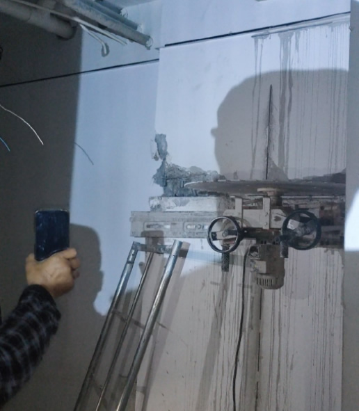 承重墙基本已经切断了,还没来得及拆卸下来,楼上已经出现裂缝预警,如果将断墙拆除下来,上部结构没有支撑,后果不堪设想。