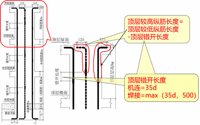 顶层较高纵筋,就是在较低纵筋的基础上,减去错开长度,具体计算过程如下图所示。
