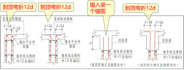 从上图可以看出,三种情况都是到顶弯折12d,只有一种情况是暗柱钢筋锚入边框梁内,因为这种情况并不多见,这里我们暂时不讲,这节课我们只讲暗柱纵筋到顶弯折12d情况。